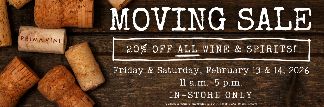 And we really don’t want to have to pack up and move a bunch of wine; we’d much rather make it yours. This Friday and Saturday, Feb. 13 & 14, everything in the store will be 20% off for customers that visit and take away their purchases. No phone or online orders, no email—just browse (maybe with a glass of wine in hand), buy and beat it!
